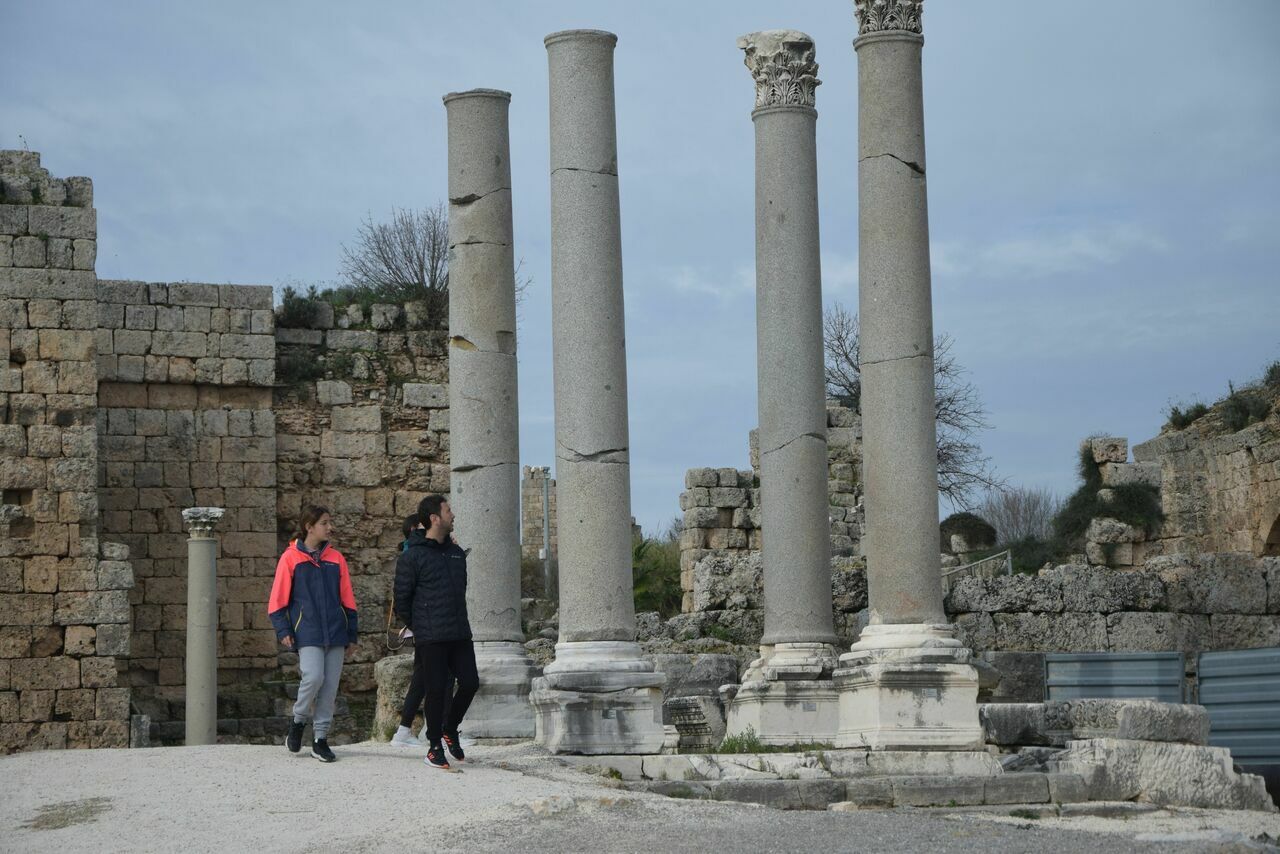 Yarıyıl tatilinin yaşandığı şu günlerde, hava durumunun mevsim normallerinin üzerinde seyretmesi nedeniyle diğer illerden gelen aileler, çocuklarıyla Perge Antik Kenti’ni baştan sona gezme fırsatı buluyor.