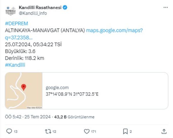 Boğaziçi Üniversitesi Kandilli Rasathanesi ve Deprem Araştırma Enstitüsü, Antalya'nın Manavgat ilçesinde 3.6 büyüklüğünde bir depremin meydana geldiğini duyurdu.