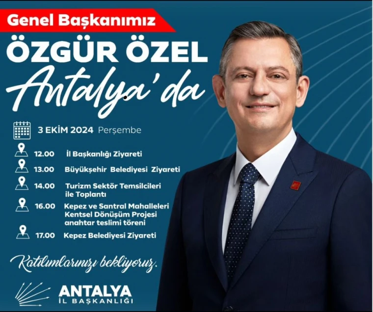 Genel Başkanımız Sayın Özgür Özel, 3 Ekim 2024 Perşembe günü Antalya’da önemli temaslarda bulunacak. Ziyaret programı kapsamında, kentsel dönüşüm projesi anahtar teslimi töreni ve turizm sektörü temsilcileriyle toplantı da yer alıyor.