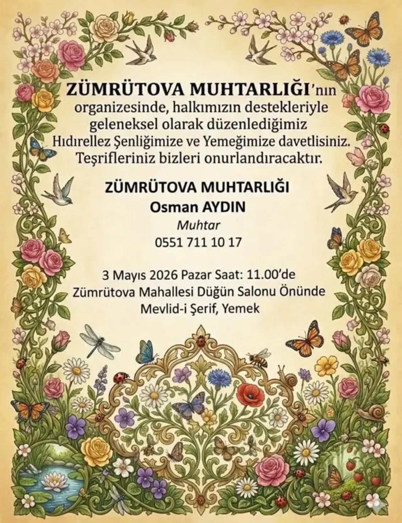 Elmalı ilçesine bağlı Zümrütova Mahallesi, baharı 3 Mayıs 2026 Pazar günü düzenlenecek kapsamlı bir programla kutlayacak. Zümrütova Mahalle Muhtarı Osman Aydın’ın ev sahipliğinde Hıdırellez Şenliği ve Yemeği düzenlenecek. Geleneksel kutlama, saat 11.00’de Zümrütova Mahallesi Düğün Salonu önünde başlayacak. Program dahilinde okunacak Mevlid-i Şerif'in ardından katılımcılara yemek ikram edilecek.