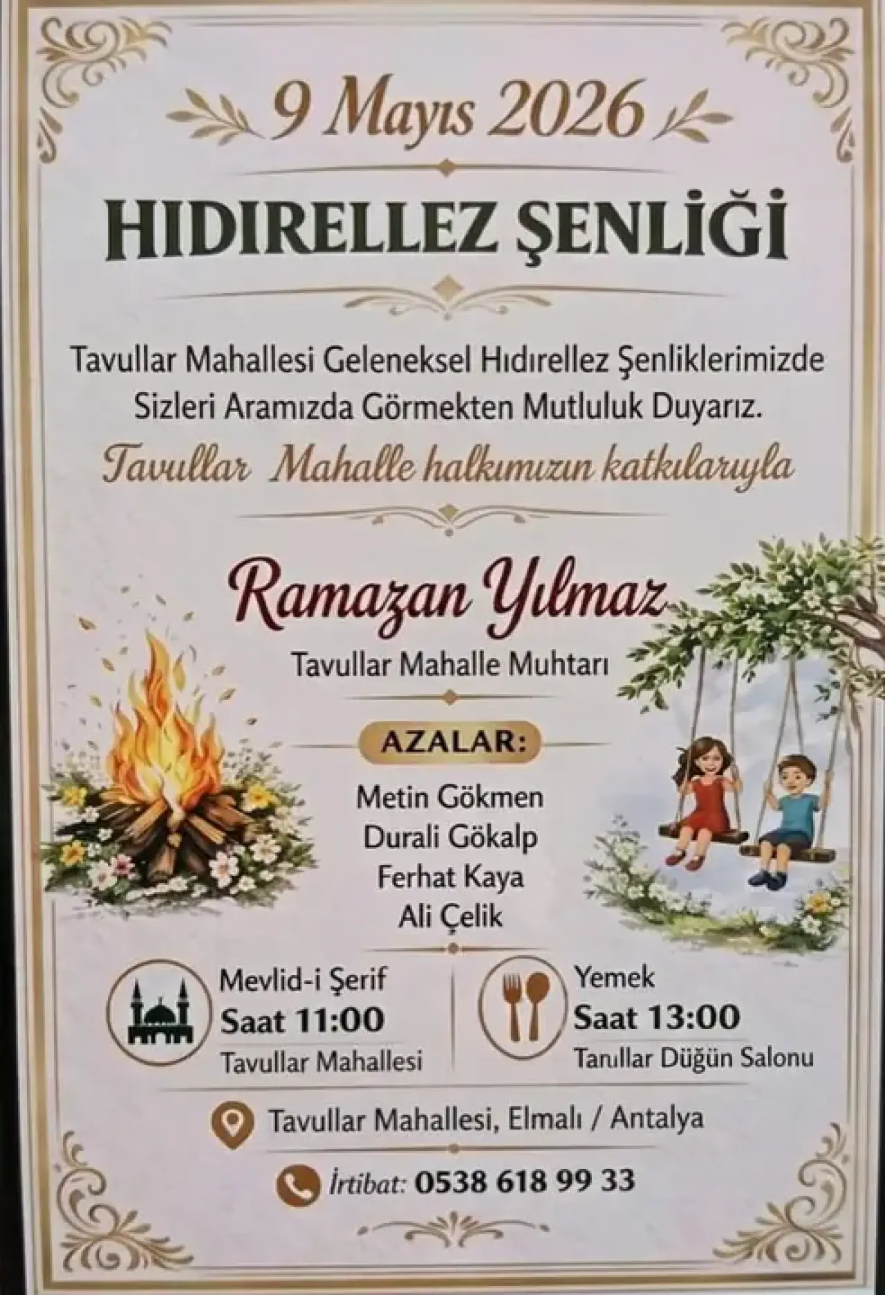 Hıdırellez heyecanı, mayıs ayının ikinci haftasında Elmalı ilçesinin Tavullar Mahallesi’ne taşınacak. Tavullar Mahalle Muhtarı Ramazan Yılmaz'ın koordinasyonunda yürütülen hazırlıklar çerçevesinde, 9 Mayıs 2026 Cumartesi günü bölge halkı bir araya gelecek. Saat 11.00’de Tavullar Mahallesi’nde gerçekleştirilecek olan Mevlid-i Şerif programını takiben, saat 13.00’te Tavullar Düğün Salonu’nda geleneksel Hıdırellez yemeği ikramı yapılacak.