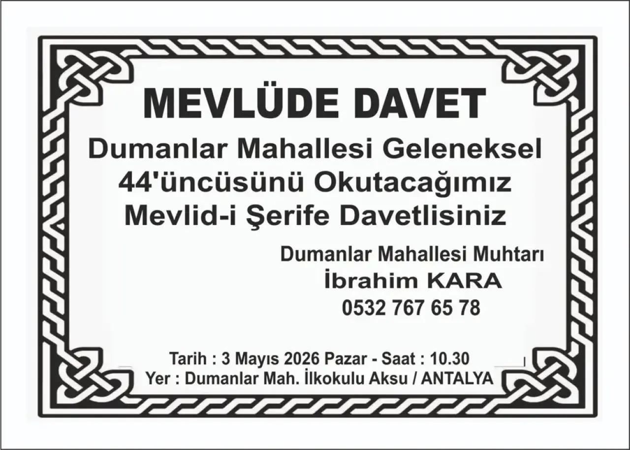 Aksu ilçesinde ise yarım asra yaklaşan bir gelenek bu yıl da bozulmadan devam ediyor. Dumanlar Mahallesi sakinleri, bu yıl 44'üncüsü düzenlenecek olan geleneksel Mevlid-i Şerif programında bir araya gelecek. Dumanlar Mahallesi Muhtarı İbrahim Kara tarafından organize edilen ve tüm mahalle halkının davetli olduğu buluşma, 3 Mayıs 2026 Pazar günü saat 10.30’da Dumanlar Mahallesi İlkokulu bahçesinde gerçekleştirilecek.