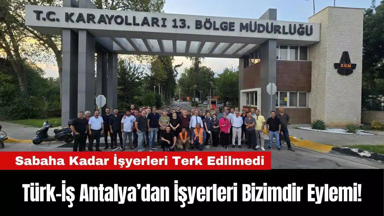 Türk-İş Konfederasyonu derinleşen yoksulluğun artması ve işçinin hayatını idame ettirememesi sebebiyle eylem kararı almıştı. Emekçiler sabaha kadar iş yerlerini terk etmeyerek iktidara, ‘emek bizim’ mesajı verdi. Artan hayat pahalılığı sebebiyle iktidardan zam isteyen emekçiler yaptıkları son eylemle taleplerini yineledi. Antalya’da farklı noktalarda gerçekleşen iş yerlerini terk etmeme eylemlerinde emekçiler iktidara seslendi. Karayolları 13. Bölge Müdürlüğü’nde sabahlayan emekçiler zam taleplerini yineledi. Yol-İş Antalya 1 Nolu Şube Başkanı ve Türk-İş Antalya İl Başkanı Cemil Ünal, “Türkiye Yol-iş Sendikası Antalya 1 Nolu Şube Başkanlığı olarak Konfederasyonumuz Türk-İş'in almış olduğu Eylem kararları doğrultusunda 14 Temmuz 2025 Pazartesi günü örgütlü olduğumuz tüm işyerlerimizde mesai saati sonunda işlerimizden ayrılmayarak, işyerlerini terk etmeyerek haklarımız için sonuna mücadele edeceğimizi gösterdik. Çalışma hayatımızın lokomotifi konumundaki kurumlarda örgütlü olan Türkiye Yol-iş Sendikasının ve Konfederasyonumuz Türk-İş'in almış olduğu ve alacağı tüm karaların sonuna kadar arkasında olduğumuzu bir kez daha gösterdik, göstermeye de devam edeceğiz” dedi.