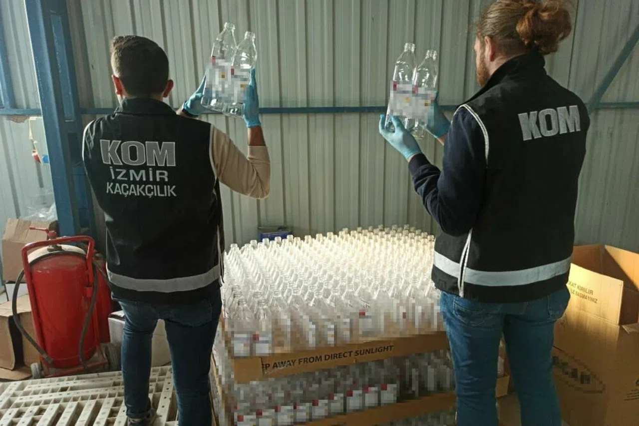 İzmir İl Emniyet Müdürlüğü Kaçakçılık Suçlarıyla Mücadele Şube Müdürlüğü ekipleri, Menemen ilçesinde bir depoda sahte alkol imalatı ve ticareti yapıldığı bilgisi üzerine çalışma başlattı. Harekete geçen ekiplerin önceden belirlediği adrese ve 2 araca yönelik gerçekleştirdiği operasyonda, 38 ton etil alkol, 3 bin bidon kapağı, bin 900 adet boş etil bidonu, 520 adet sahte etiket, 2 adet soğutucu fan, 1 adet 1 tonluk arıtma kazanı ve 1 adet çeşmeli dolum makinesi ele geçirildi. Olayla ilgili 4 şüpheli gözaltına alındı.