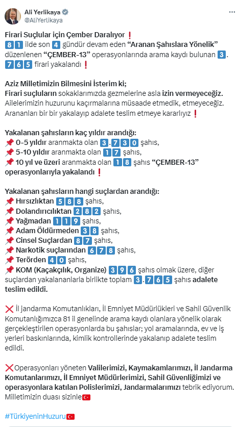 İstanbul Valisi Ali Yerlikaya, sosyal medya hesabından yaptığı paylaşımda, son dört gündür 81 ilde devam eden "Aranan Şahıslara Yönelik" operasyonlarında büyük bir başarı elde edildiğini duyurdu. Yerlikaya, operasyonlar kapsamında 3.765 firari şahsın yakalandığını belirtti.
