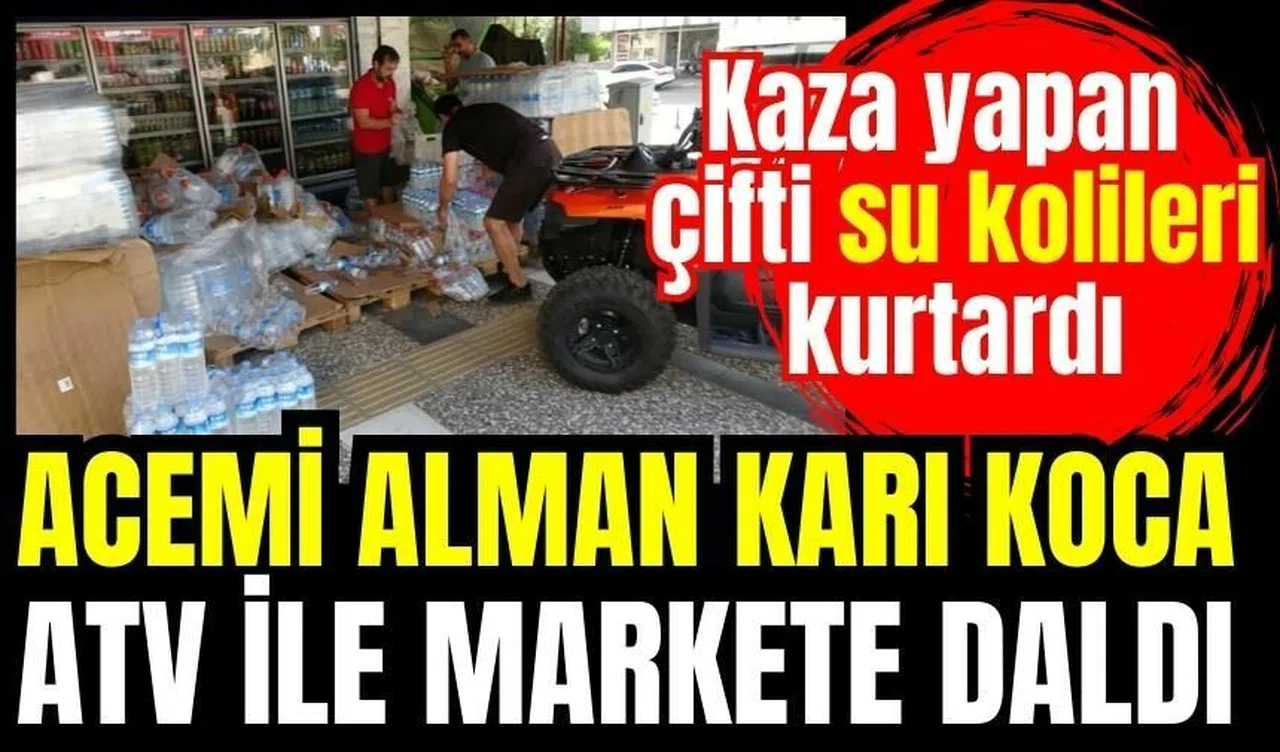 Antalya’nın Manavgat ilçesinde kullandıkları ATV kontrolden çıkan Alman karı-koca ölümden döndü. Marketin önünde bulunan istiflenmiş haldeki plastik su kolilerine çarparak durabilen çift kazayı hafif yaralı olarak atlatırken, su şişelerinin hava yastığı görevi yaptığı kaza anları marketin güvenlik kamerasına yansıdı.