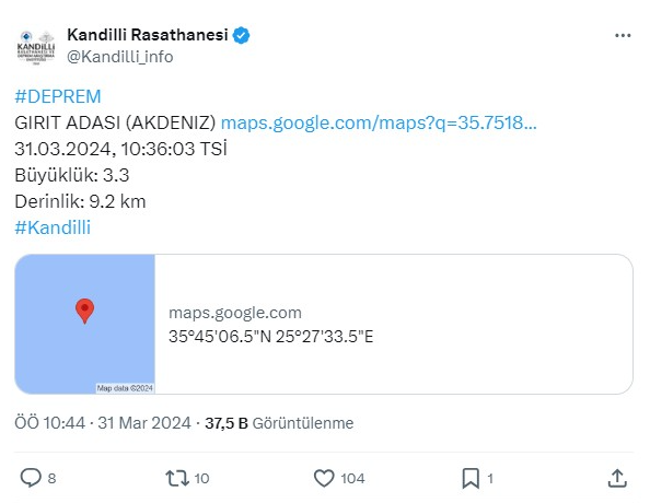 Boğaziçi Üniversitesi Kandilli Rasathanesi, Akdeniz'in Girit Adası'nda meydana gelen 3.3 büyüklüğündeki depremi duyurdu. Rasathane tarafından yapılan açıklamaya göre, deprem yerel saatle 10.36'da kaydedildi. Depremin derinliği ise yaklaşık olarak 9.2 kilometre olarak ölçüldü.