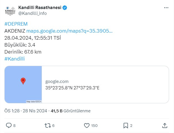 Boğaziçi Üniversitesi Kandilli Rasathanesi ve Deprem Araştırma Enstitüsü, Akdeniz bölgesinde 3.4 büyüklüğünde bir depremin meydana geldiğini duyurdu.