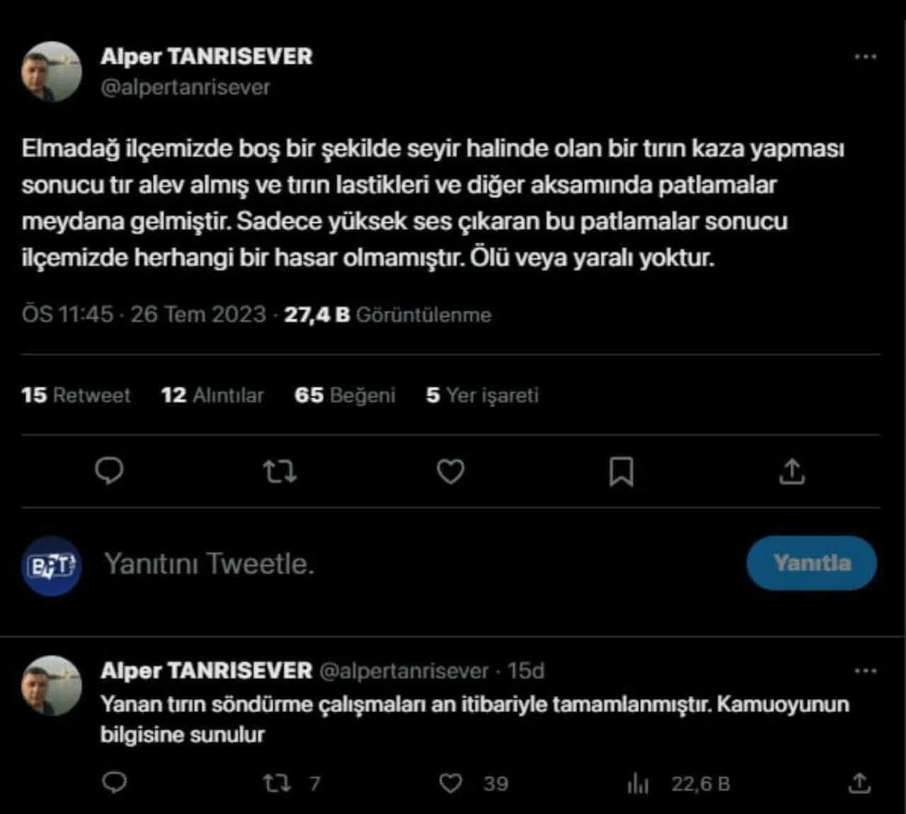 Yanan tırın söndürme çalışmaları an itibariyle tamamlanmıştır. Kamuoyunun bilgisine sunulur— Alper TANRISEVER (@alpertanrisever) July 26, 2023