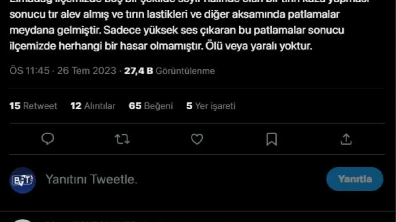 Elmadağ ilçemizde boş bir şekilde seyir halinde olan bir tırın kaza yapması sonucu tır alev almış ve tırın lastikleri ve diğer aksamında patlamalar meydana gelmiştir. Sadece yüksek ses çıkaran bu patlamalar sonucu ilçemizde herhangi bir hasar olmamıştır. Ölü veya yaralı yoktur.— Alper TANRISEVER (@alpertanrisever) July 26, 2023