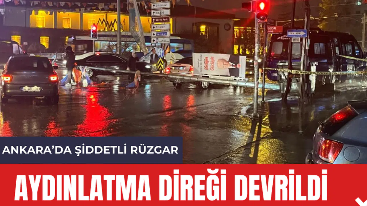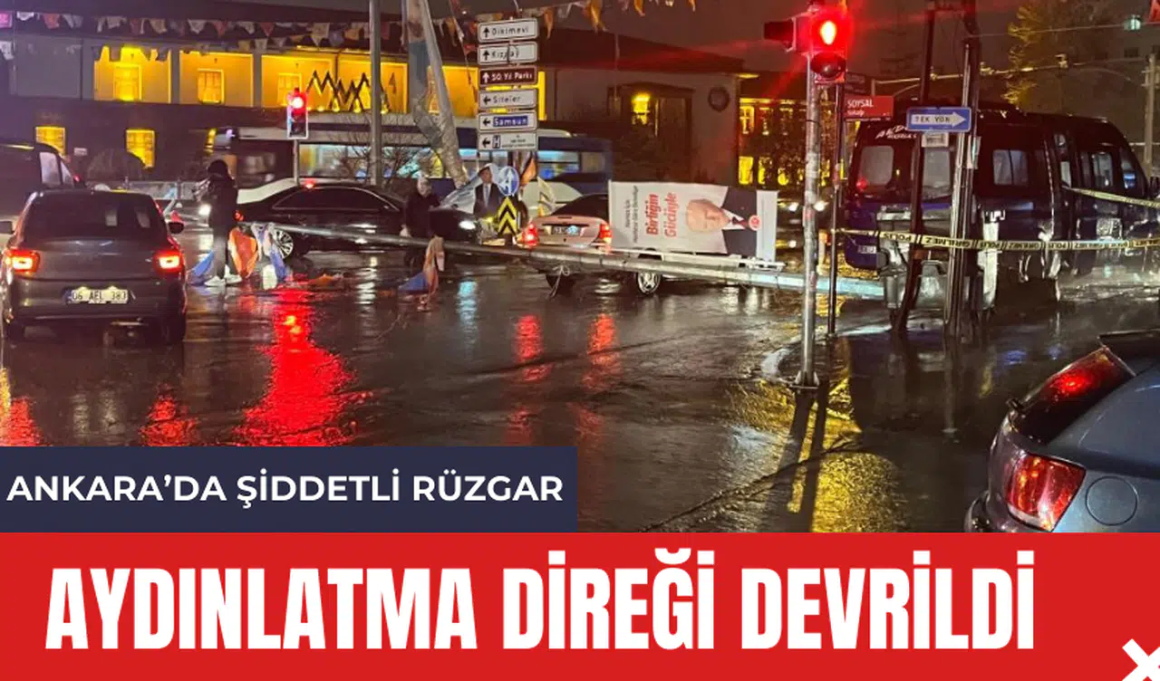 Ankara'da akşam saatlerinde etkili olan fırtınada aydınlatma direği yola devrildi.