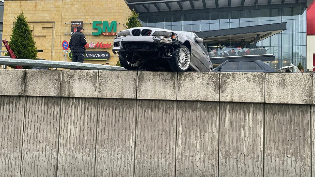 Kayseri’nin Melikgazi ilçesinde bariyerlere çarpan otomobil köprüde asılı kalırken, kazada sürücü yaralandı.