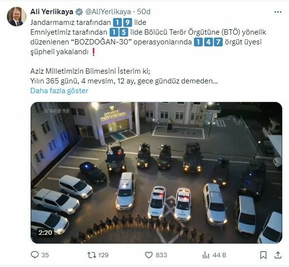 İçişleri Bakanı Ali Yerlikaya’nın paylaştığı bilgilere göre, İl Jandarma Komutanlıklarınca Adıyaman, Ağrı, Aydın, Burdur, Diyarbakır, Edirne, Erzurum, Gaziantep, Giresun, Hatay, İstanbul, Kocaeli, Kilis, Osmaniye, Rize, Siirt, Şırnak, Tekirdağ ve Van’da operasyonlar düzenlendi. Jandarma tarafından 19 ilde düzenlenen operasyonlarda şüphelilerin, sosyal medya hesapları üzerinden ter*r örgütü propagandası yaptıkları, ter*r örgütüne üye olma ve ter*r örgütüne yardım ve yataklık etme suçlarını işledikleri tespit edildi.