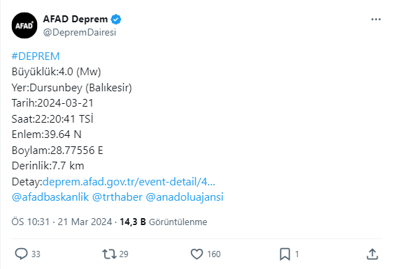 Balıkesir'de meydana gelen deprem, Kandilli Rasathanesi'nin verilerine göre, Dursunbey'de saat 22.20'de gerçekleşti. Depremin büyüklüğü 4.1 olarak ölçülürken, yerin 5.3 kilometre derinliğinde olduğu tespit edildi.