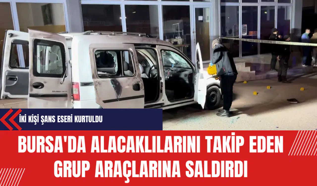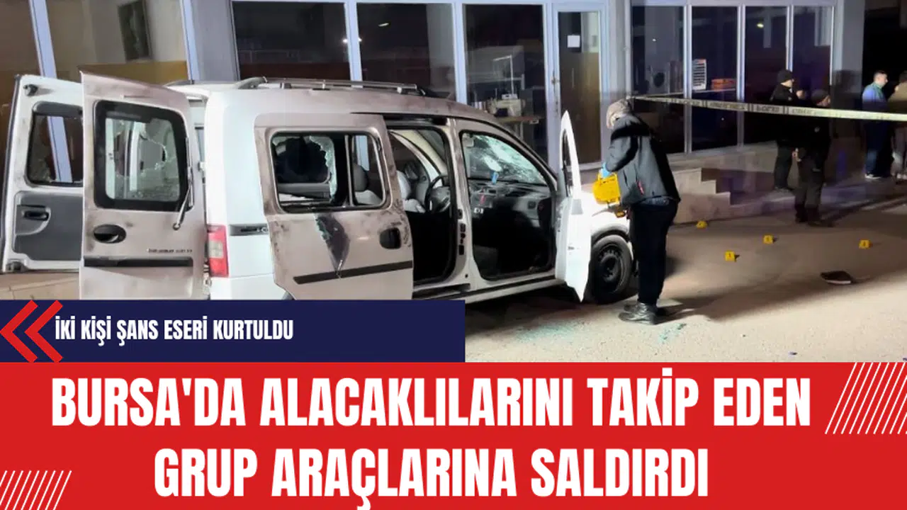 Bursa'da gerçekleşen olayda, bir grup alacaklılarını takip eden şüpheliler, takip ettikleri aracı kurşuna dizdi. Araç içerisinde bulunan iki kişi şans eseri yara almadı ancak araç ağır hasar gördü. Polis, saldırganların yakalanması için çalışmalarına devam ediyor.