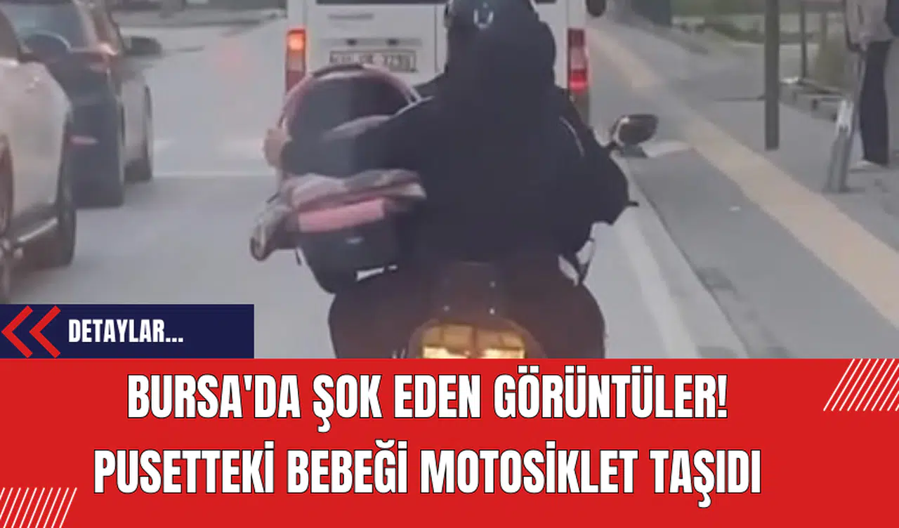 Bursa'da bir motosiklet sürücüsü, işlek bir cadde üzerinde eşiyle birlikte seyir halindeyken bebeği pusette taşıdı. Olay, merkez Yıldırım ilçesi Hacivat Mahallesi'nde yaşandı.
