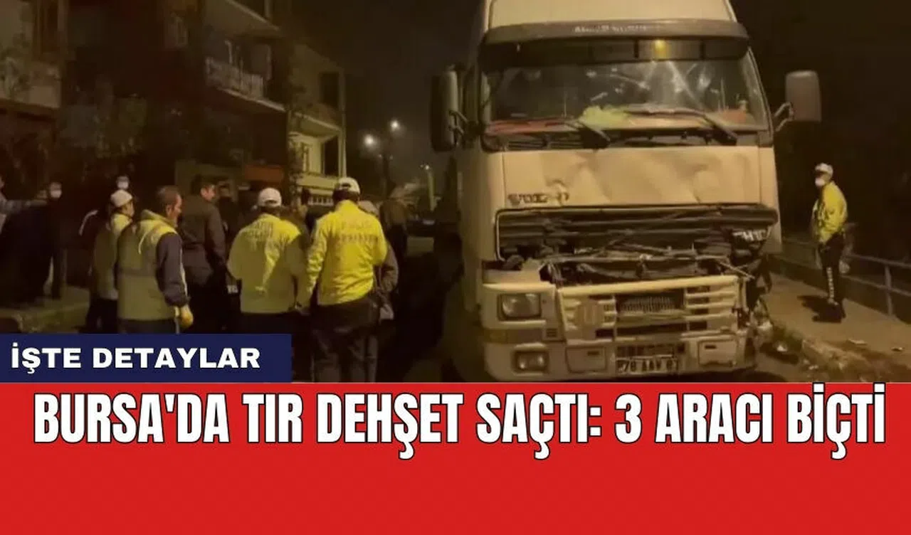 Bursa'nın İnegöl ilçesinde freni boşalan tır dehşet saçtı. Yokuş aşağı hareket eden önce devrildi, ardından 3 araca çarptı.