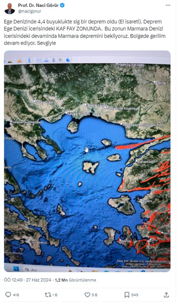 Görür, depremin Ege Denizi'ndeki Kuzey Anadolu Fay Zonu'nda gerçekleştiğini belirterek, 'Ege Denizi'nde 4,4 büyüklükte sig bir deprem oldu. Deprem Ege Denizi içerisindeki KAF FAY ZONUNDA. Bu zonun Marmara Denizi içerisindeki devamında Marmara depremini bekliyoruz. Bölgede gerilim devam ediyor. Sevgiyle' dedi.