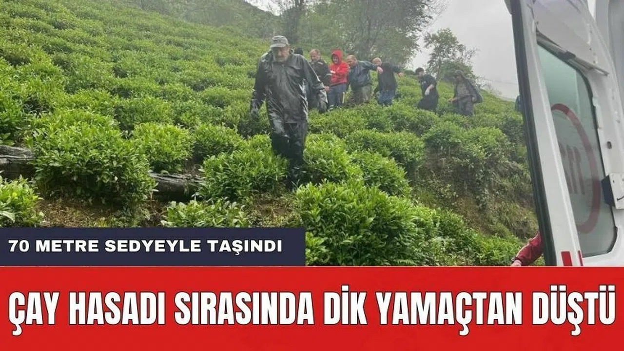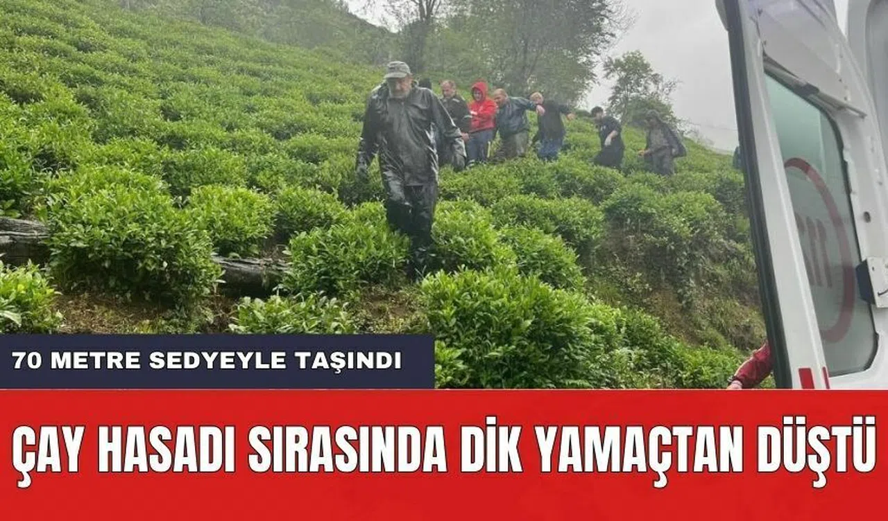 Rize'de çay hasadı sırasında dengesini kaybederek düşen şahıs, 70 metre boyunca sedye ile taşınarak hastaneye kaldırıldı.