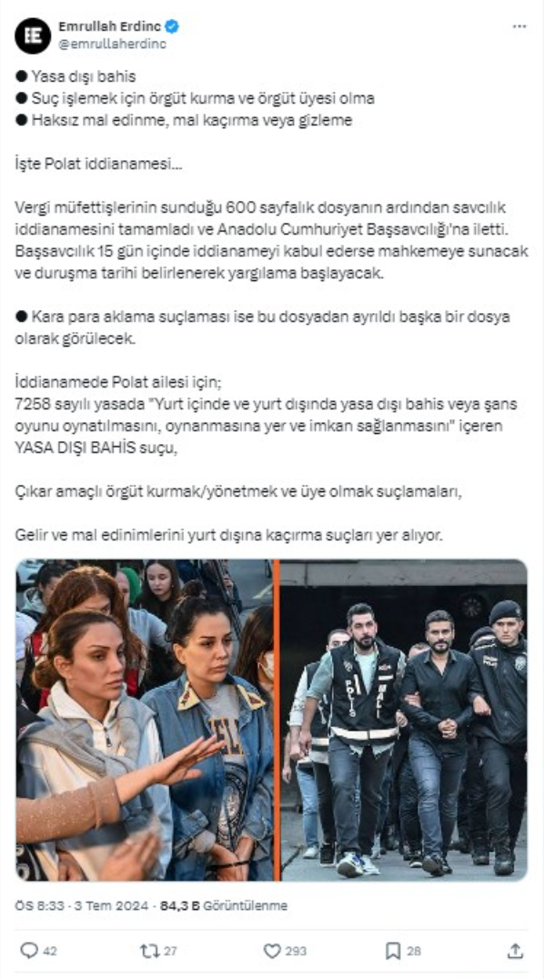Gazeteci Emrullah Erdinç, sosyal medya hesabı üzerinden Polat ailesi hakkında çarpıcı iddialar paylaştı. Erdinç, Polat ailesine yönelik hazırlanan iddianamenin detaylarını aktardı.