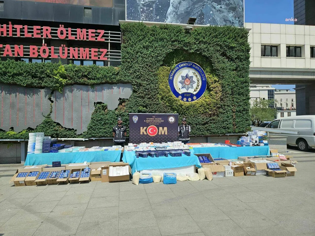Sahte botoks, kanser ilacı, hormon ve kırmızı reçeteli ilaçları üretip bunları iç ve dış piyasaya sürdükleri anlaşılan yabancı uyruklu şüphelilerden ele geçirilen sahte ilaçların piyasa değerinin yaklaşık 30 milyon lirayı bulduğu ifade edilirken bu ürünler bugün emniyetin bahçesinde sergilendi.