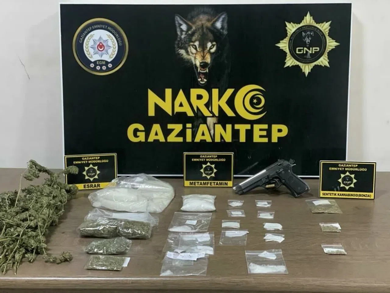 Şüphelilerin adreslerinde yapılan aramalarda 1 kilo 122 gram metamfetamin, 290 gram esrar, 8 gram sentetik kannabinoid, 1 adet ruhsatsız tabanca ve 1 adet hassas terazi ele geçirildi.