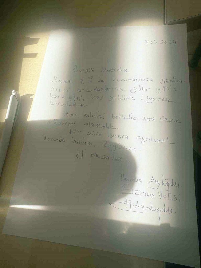 Vali Aydoğdu, mesaiye zamanında gelen çalışanlarla görüştükten sonra, kurum müdürünü beklemeye başladı. Ancak, müdürün mesaiye gelmemesi üzerine, Aydoğdu kurumdan ayrıldı ve müdüre verilmek üzere bir mektup bıraktı.
