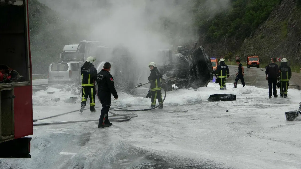 Facianın eşiğinden dönülen kaza Antalya Burdur karayolu Çubukbeli mevkiinde bu sabah saatlerinde yaşandı. Edinilen bilgiye göre Nihat Duman idarsindeki 34 ZJ 2517 plakalı boya ve tiner yüklü TIR'ın freni patladı.TIR'ı kontrol edemeyen sürücü, aynı yönde seyreden Mehmet Badır idaresindeki 07 YBA 51 plakalı kamyonete arkadan çarptı. Çarpmanın ardından yan yatan TIR'da başlayan yangın 14 ton boya ve tinerlerin alev almasıyla birlikte alev topuna döndü. Kazada TIR sürücüsü Nihat Duman ile kamyonette bulunun sürücü Mehmet Batır ile yolcular Haşim Şen ve Beşir yıldız kazayı hafif yaralı olarak atlatırken ihbar üzerine bölgeye çok sayıda sağlık ve itfaiye ekibi sevk edildi. Antalya Büyükşehir Belediyesi İtfaiyesi ekiplerinin köpükle yaptığı müdahale ile yaklaşık bir saatte söndürülen yangın sebebiyle Antalya Burdur karayolunda trafik kilitlendi. Siyah dumanların gökyüzünü kapladığı olayda itfaiye ekipleri soğutma çalışması yaptıktan sonra yol trafiğe yeniden açıldı.