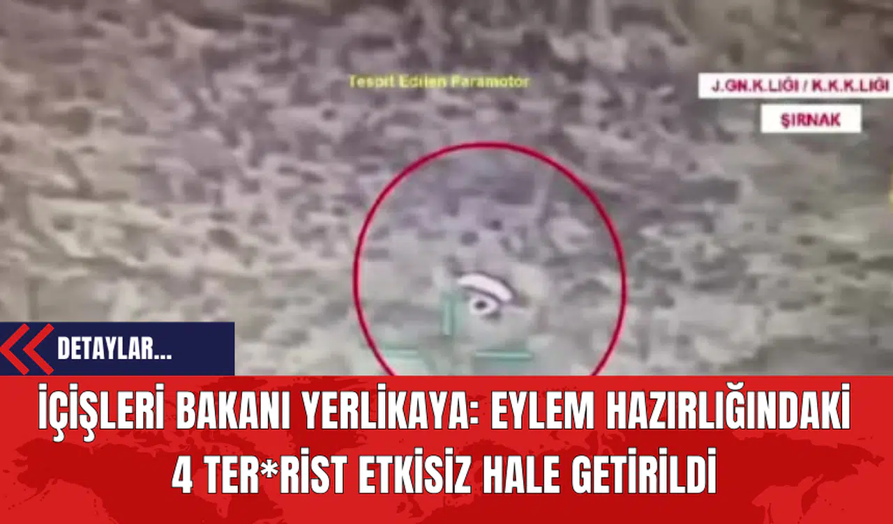 İçişleri Bakanı Ali Yerlikaya, sosyal medya hesabından yaptığı açıklamada, Şırnak'ın Uludere ilçesi Düğün Dağı mevkiinde paramotor kullanarak Türkiye'ye giriş yapan ve eylem hazırlığında bulunan 4 ter*ristin etkisiz hale getirildiğini belirtti.