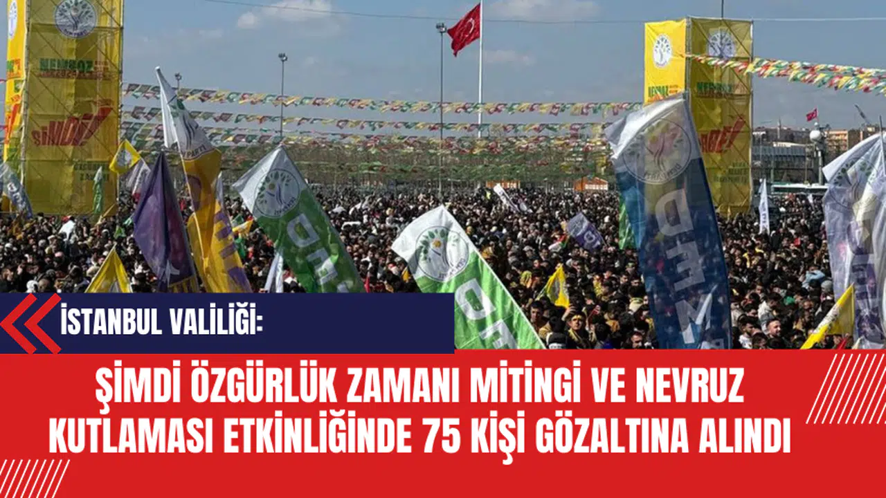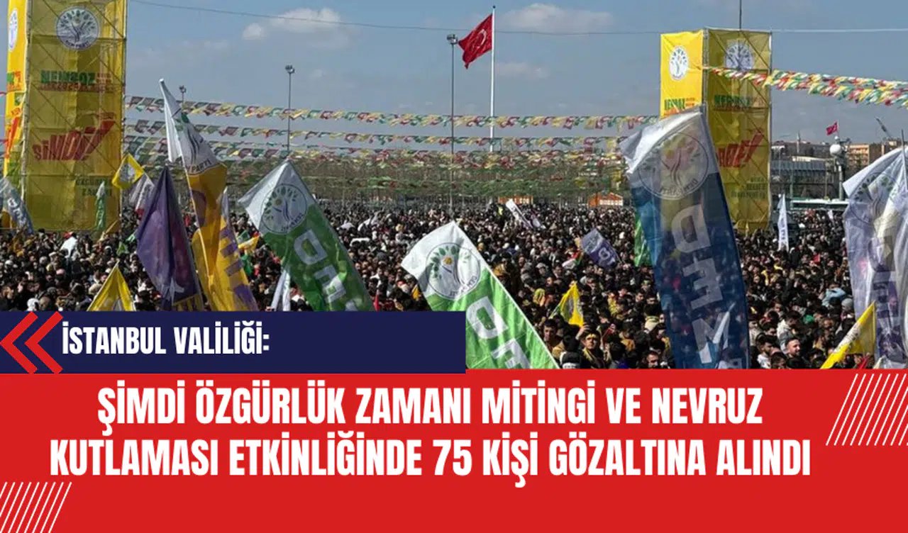 İstanbul Valiliği tarafından yapılan açıklamada, "Fatih ilçesi Yenikapı Miting alanında Halkların Eşitlik ve Demokrasi Partisi (DEM Parti) organizesinde bugün saat 10.00-17.00 arasında 'Şimdi Özgürlük Zamanı' konulu miting ve 'Nevruz Kutlaması' etkinliği düzenlenmiştir. Söz konusu etkinlik nedeniyle alan ve çevresinde yapılan güvenlik uygulamalarında; etkinlik alanındaki kule üzerinde PKK/KCK silahlı terör örgütü elebaşı Abdullah Öcalan posteri açtığı tespit edilen (M.A.), (Ş.A.) ve (Y.Ö.) adlı şahıslar gözaltına alınmıştır. Alan çevresinde yapılan güvenlik uygulamalarında ise ‘terör örgütü propagandası yapmak’ suçundan, arama kaydı bulunan (M.K.) ve (M.B.) adlı şahıslar gözaltına alınmıştır. Etkinlik alanı ve çevresinde polise mukavemet gösteren, taşkınlık çıkaran, yasa dışı slogan atarak terör örgütü propagandası yaptığı tespit edilen toplam 70 şahıs hakkında gözaltı işlemi uygulanmıştır. Terörle mücadelemiz kararlılıkla devam edecektir" ifadelerine yer verildi.