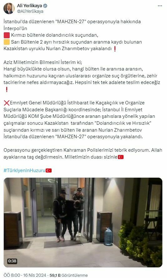 İçişleri Bakanı Ali Yerlikaya, İstanbul'da gerçekleştirilen Mahzen-27 Operasyonu kapsamında Interpol'ün kırmızı bültenle aradığı Kazakistan vatandaşı Nurlan Zharımbetov'un yakalandığını duyurdu.