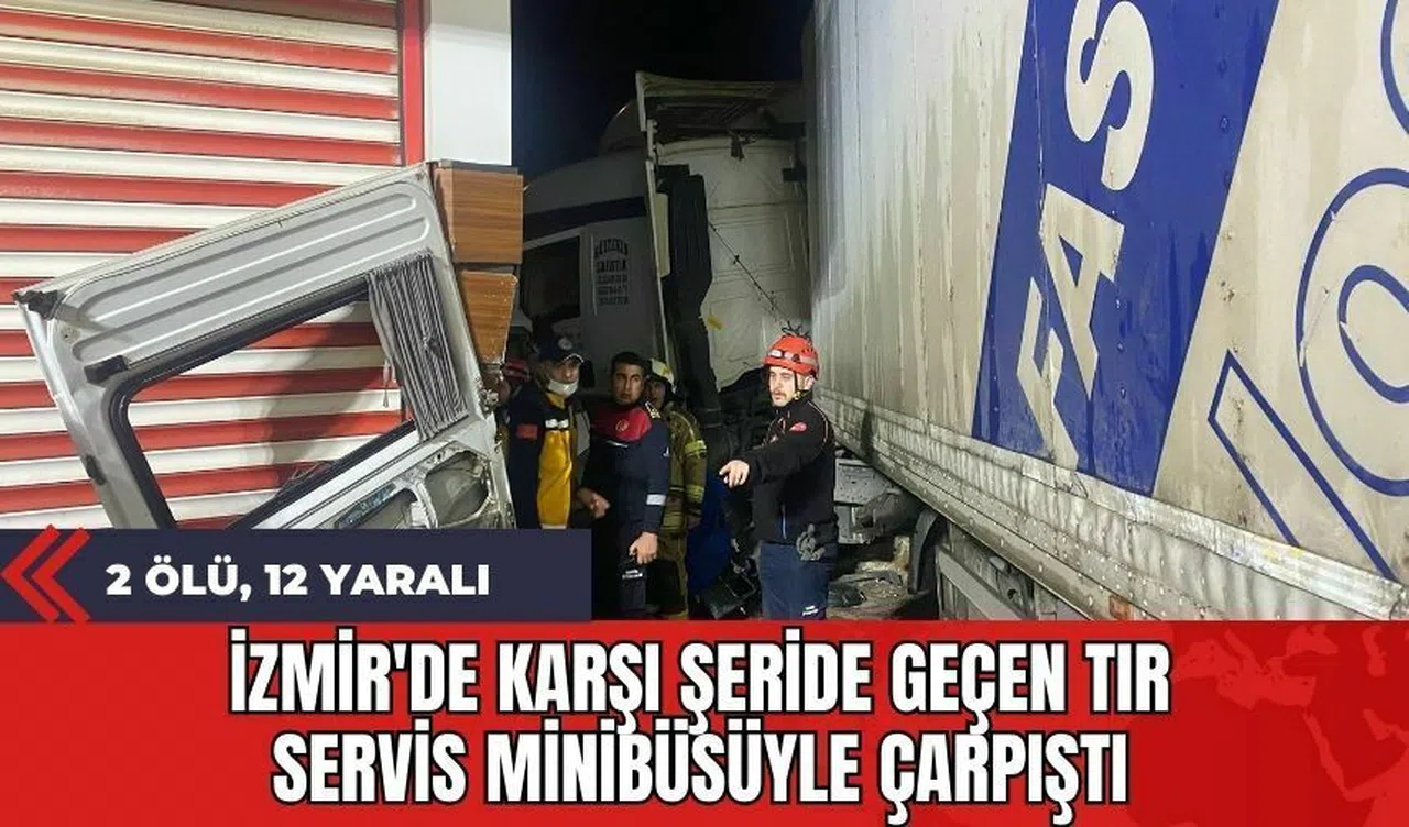 İzmir'in Torbalı ilçesinde meydana gelen feci bir trafik kazası, şehri yasa boğdu. Hızla karşı şeride geçen bir tır ile servis minibüsünün kafa kafaya çarpışması sonucu 2 kişi hayatını kaybederken, 12 kişi de yaralandı.