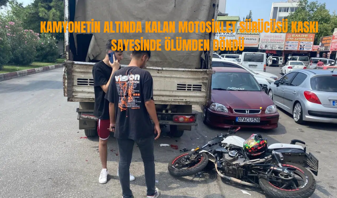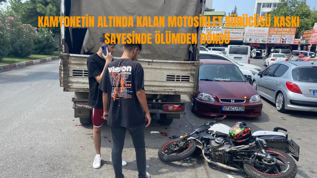 Antalya’da otomobil ile çarpışan motosiklet sürücüsü dengesini kaybederek park halindeki kamyonete arkadan çarptı. Motosiklet sürücüsü kaskı sayesinde ölümden döndü.