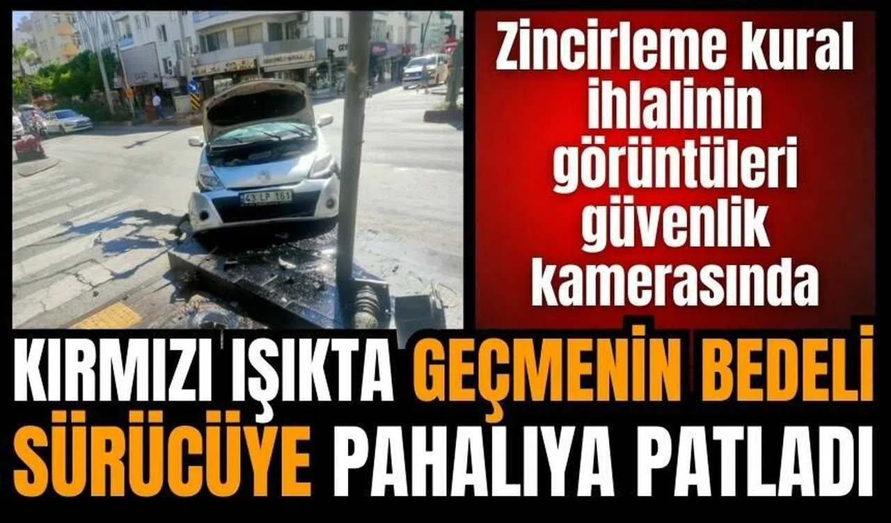 Antalya'nın Manavgat ilçesinde kırmızı ışık yapan otomobil sürücüsü, Atatürk Caddesinden çıkan otomobile çarpmamak için kaldırıma çıktı. Kaldırıma çıkan otomobil metal dubayı yıktıktan sonra trafik lambasının direğine çarptıktan sonra durabildi. O anlar güvenlik kameralarına yansıdı.