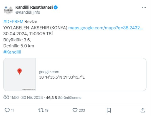 Boğaziçi Üniversitesi Kandilli Rasathanesi ve Deprem Araştırma Enstitüsü, Konya'nın Akşehir ilçesinde 3.6 büyüklüğünde bir depremin meydana geldiğini duyurdu.