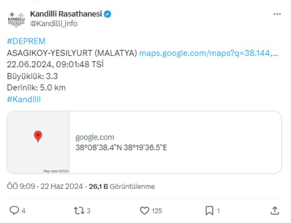 Boğaziçi Üniversitesi Kandilli Rasathanesi ve Deprem Araştırma Enstitüsü, Malatya'nın Yeşilyurt ilçesinde 3.3 büyüklüğünde bir depremin meydana geldiğini duyurdu.