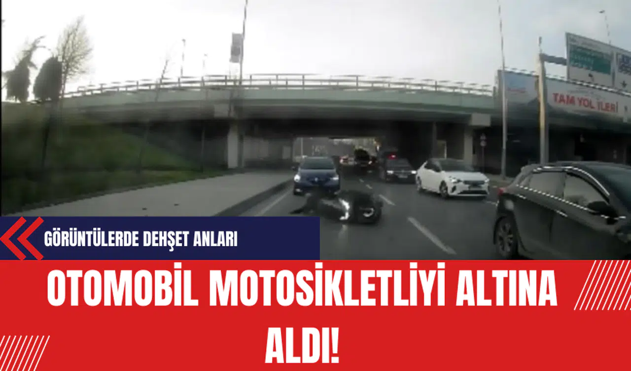 Metrelerce aracın altında sürüklenen sürücü, bir başka aracın altına girdi. Feci kaza kameralara yansırken, bir başka motosikletli ise otomobil sürücüsüne tepki gösterdi.
