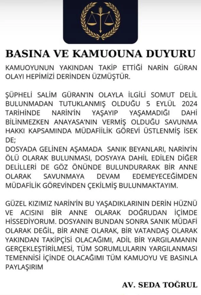 Salim Güran'ın avukatı olan Seda Toğrul, 5 Eylül’de üstlendiği müdafilik görevinden çekildiğini belirterek, kararını bir açıklamayla kamuoyuna duyurdu. Toğrul, açıklamasında hem Narin'in ölümü hem de bir anne olarak yaşadığı duygusal zorluklara dikkat çekti. İşte Toğrul’un açıklaması: