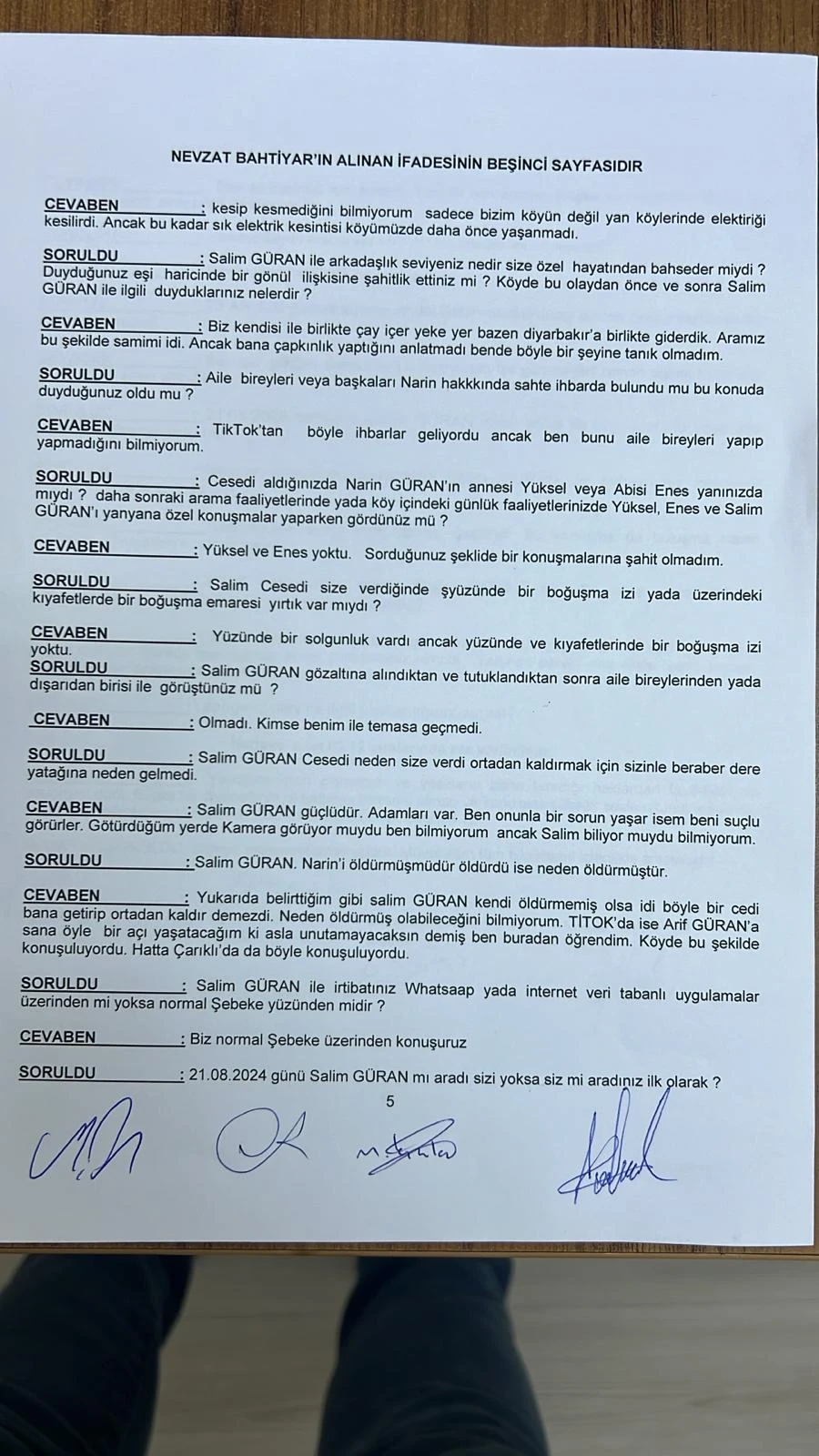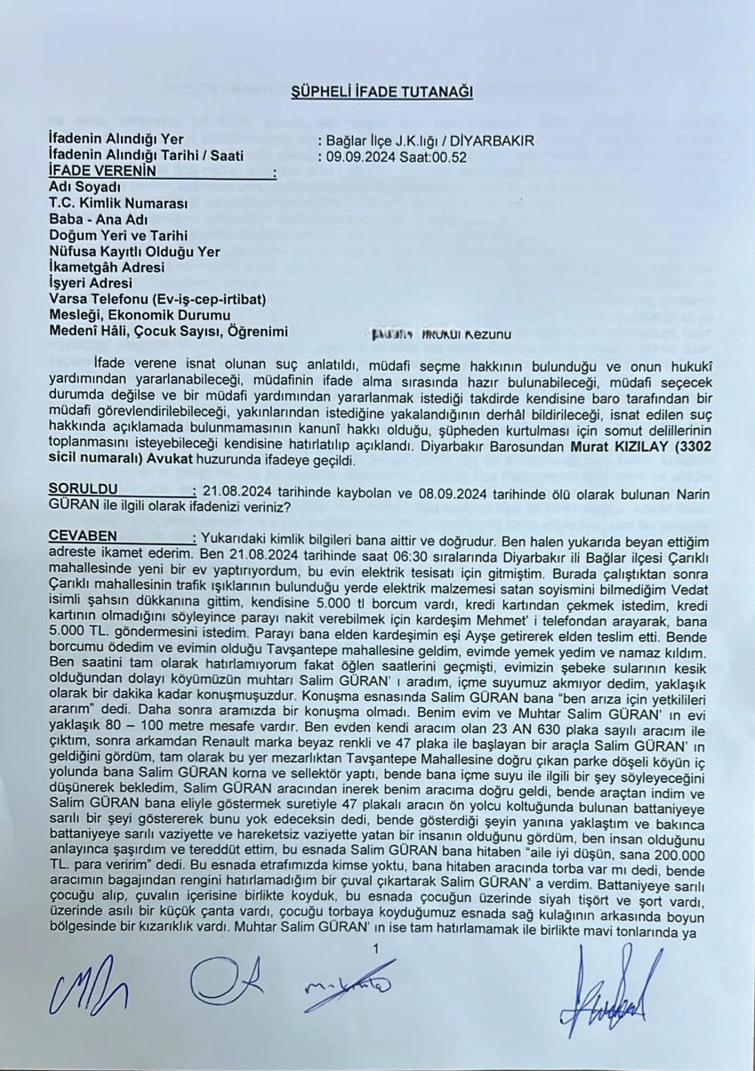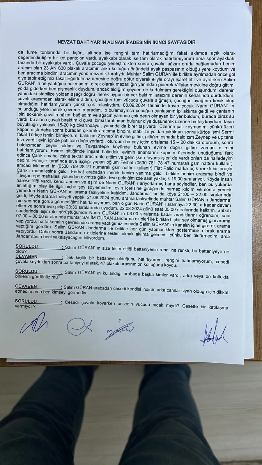 Narin Güran’ın cinayetinde ikinci itiraf ortaya çıktı. İlk itiraftan sonra, zanlı sorgusunda olayın detaylarını anlatarak, yaşananları tek tek açıkladı.