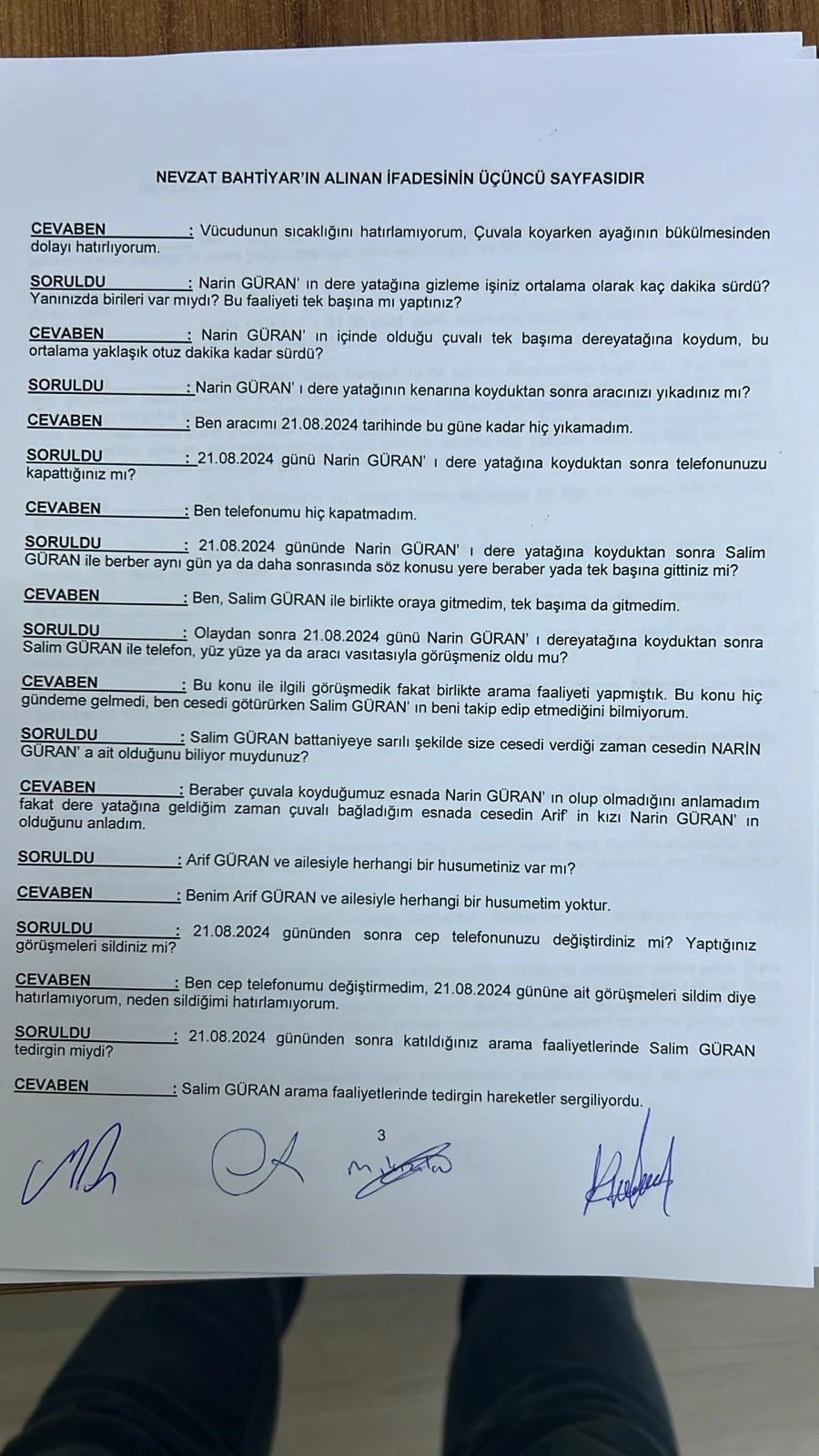 Cinayetin ardından eve dönen N.B., namaz kıldığını ve köydeki arama çalışmalarına katıldığını itiraf etti. Narin’i dere yatağına gizleme işinin yaklaşık yarım saat sürdüğünü belirten N.B., çuvalı bağladığı sırada içeridekinin Narin Güran olduğunu fark ettiğini söyledi. Ayrıca, Salim Güran'ın arama çalışmaları sırasında kanalın içine girerek göstermelik arama yaptığını da söyledi.