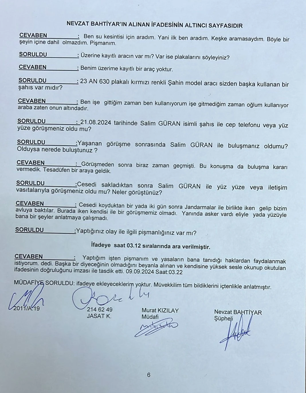 21 Ağustos günü köyün şebeke suyunun kesilmesi üzerine muhtarı aradığını söyleyen N.B., Salim Güran'ın kendisine "Ben yetkilileri ararım" dediğini belirtti. Ardından evinden çıktığında, muhtarın aracının kendisini takip ettiğini fark ettiğini söyledi. Muhtarın, aracındaki battaniyeye sarılı bir şeyi kendisine gösterip, "Bunu yok edeceksin" dediğini anlatan N.B., ne olduğunu anlamak için yaklaştığında, battaniyeye sarılı hareketsiz bir bedenle karşılaştığını ifade etti.