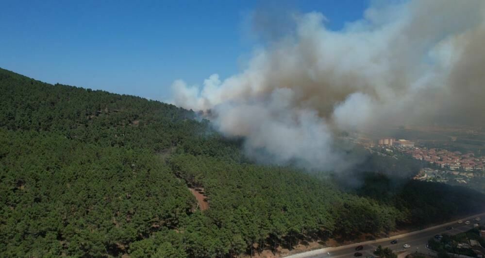 İtfaiye ekiplerinin yangına havadan ve karadan müdahalesi sürüyor. Alevli dumanlar çevre ilçelerden de fark edildi. Öte yandan, Aydos Ormanı’nda çıkan yangın dron ile havadan görüntülendi.