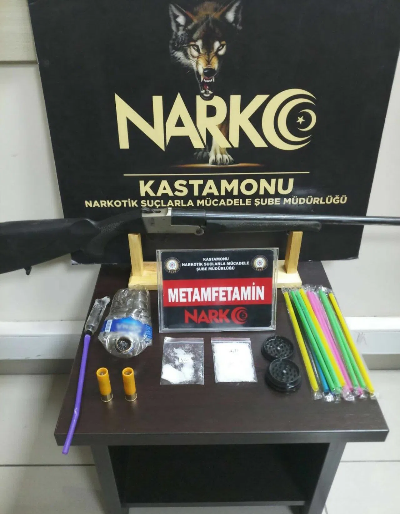 Şahısların aracında yapılan aramalarda ise 1 adet uy*şturucu madde öğütmede kullanılan aparat, 13 adet uy*şturucu madde içiminde kullanılan pipet, 1 adet uy*şturucu madde içiminde kullanılan cam düzenek, 1 adet uy*şturucu madde içiminde kullanılan düzenek, 1 adet ruhsatsız av tüfeği ve tüfeğe ait 2 adet kartuş ele geçirildi.