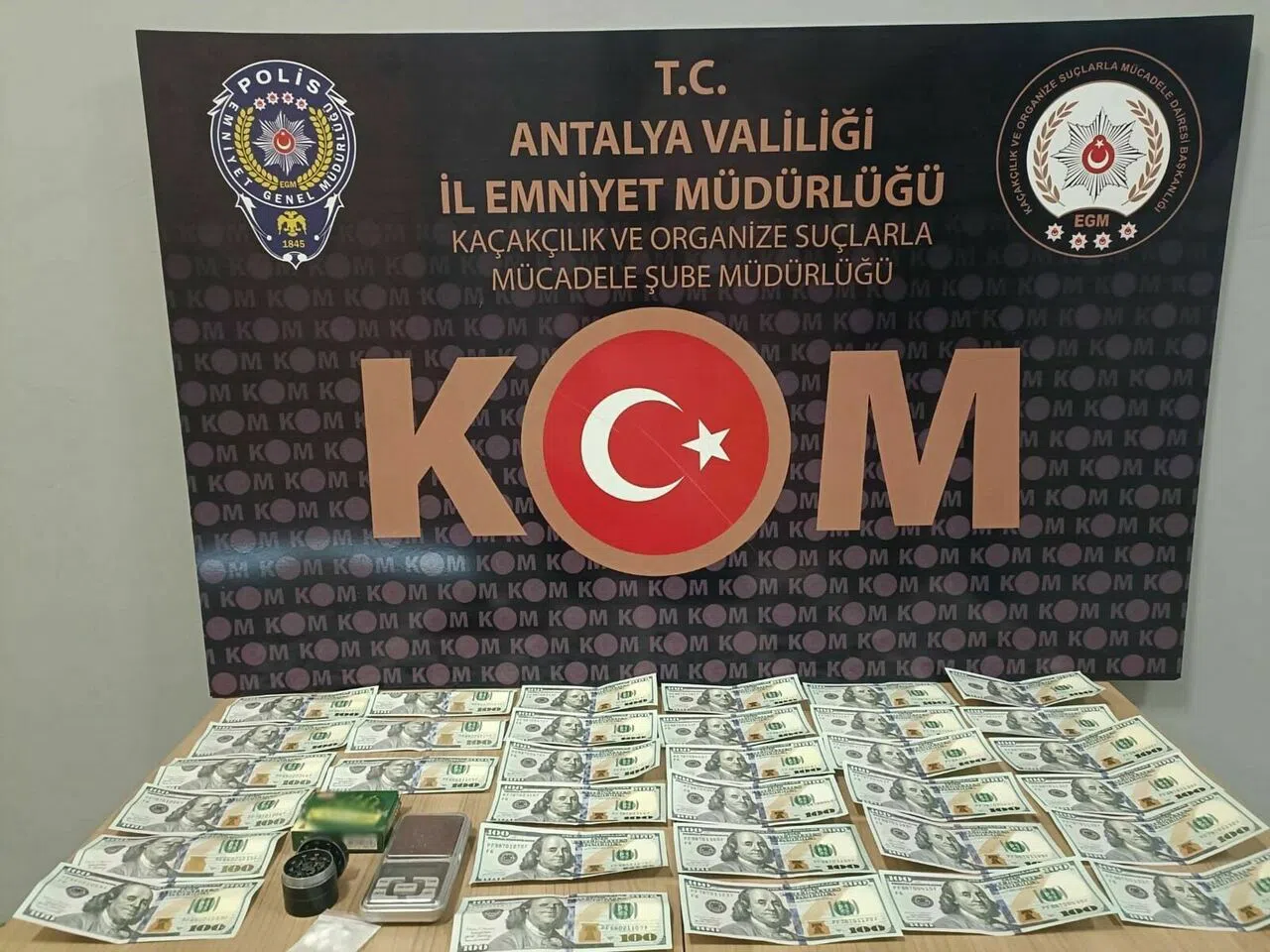 Antalya'da 3 esnafa 4 adet sahte 100 dolar verilmesi üzerine Kaçakçılık ve Organize Suçlarla Mücadele Şube Müdürlüğüne bağlı Mali Suçlar Büro Amirliği ekipleri harekete geçti. Yapılan araştırmalar sonucunda, parada sahtecilik olaylarını gerçekleştirenlerin yabancı uyruklu 4 şahıs olduğu tespit edildi. Şüphelilerden 1'i Hurma Mahallesi'nde üzerinde 23 adet sahte 100 dolar ile yakalandı. Diğer 3 şüpheli ise Liman Mahallesi'ndeki adreslerinde yakalandı. Burada yapılan aramalarda; 9 adet sahte 100 dolar, 9 adet uyuşturucu hap, 9 parça halinde esrar ve küçük terazi ele geçirildi. Gözaltına alınan 4 yabancı uyruklu şahıs hakkında "parada sahtecilik" ve "uyuşturucu madde ticareti" suçlarından işlem yapılarak adliyeye sevk edildi. İHA