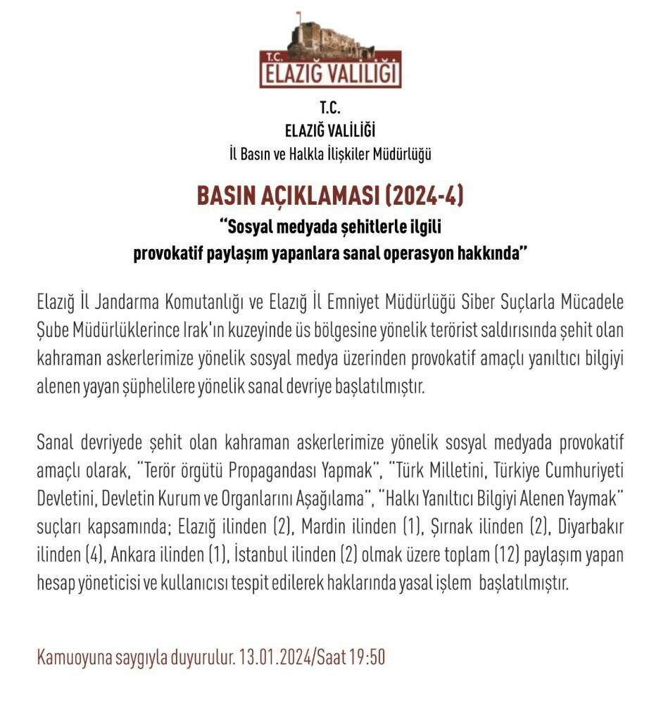 Elazığ Valiliğinden yapılan açıklamada, 'Sosyal medyada şehitlerle ilgili provokatif paylasim yapanlara sanal operasyon hakkında, Elazığ il Jandarma Komutanlığı ve Elazığ İl Emniyet Müdürlüğü Siber Suçlarla Mücadele Şube Müdürlüklerince Irak'ın kuzeyinde üs bölgesine yönelik terörist saldırısında şehit olan kahraman askerlerimize yönelik sosyal medya üzerinden provokatif amaçlı yanıltıcı bilgiyi alenen yayan şüphelilere yönelik sanal devriye başlatılmıştır.