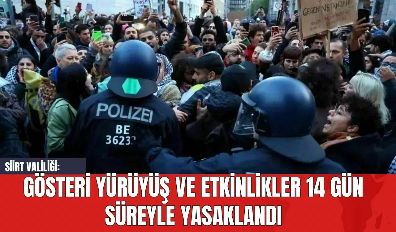Siirt Valiliği, milli birlik ve beraberliği zedeleyici provokatif eylemlerin önüne geçilmesi amacıyla gösteri, yürüyüş, etkinlik ve eylemlerin 14 gün süreyle yasaklandığını duyurdu.