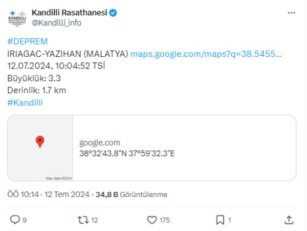 Boğaziçi Üniversitesi Kandilli Rasathanesi ve Deprem Araştırma Enstitüsü, Malatya'nın Yazıhan ilçesinde 3.3 büyüklüğünde bir depremin meydana geldiğini duyurdu.