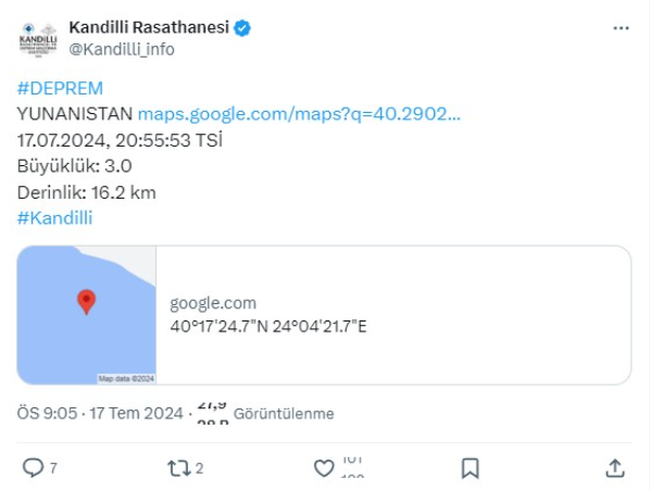 Boğaziçi Üniversitesi Kandilli Rasathanesi ve Deprem Araştırma Enstitüsü, Yunanistan da 3.0 büyüklüğünde bir depremin meydana geldiğini duyurdu.