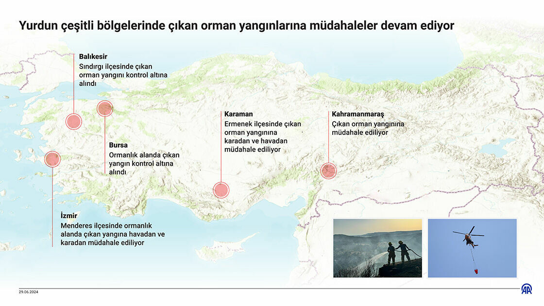 Yangına 2 helikopter, 8 arazöz ve 9 su tankeriyle müdahale ederek kontrol altına alan ekipler, soğutma çalışmasını sürdürüyor.