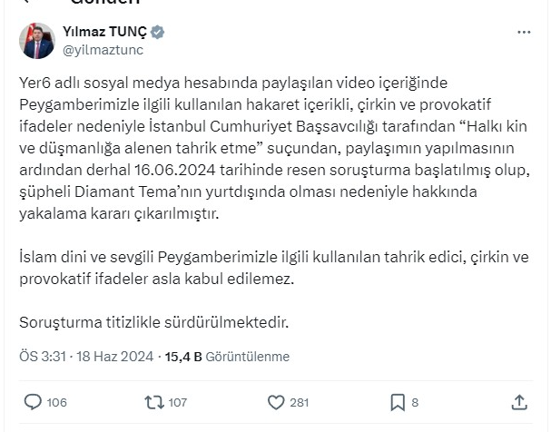 'Yer6 adlı sosyal medya hesabında paylaşılan video içeriğinde Peygamberimizle ilgili kullanılan hakaret içerikli, çirkin ve provokatif ifadeler nedeniyle İstanbul Cumhuriyet Başsavcılığı tarafından “Halkı kin ve düşmanlığa alenen tahrik etme” suçundan, paylaşımın yapılmasının ardından derhal 16.06.2024 tarihinde resen soruşturma başlatılmış olup, şüpheli Diamant Tema’nın yurtdışında olması nedeniyle hakkında yakalama kararı çıkarılmıştır.